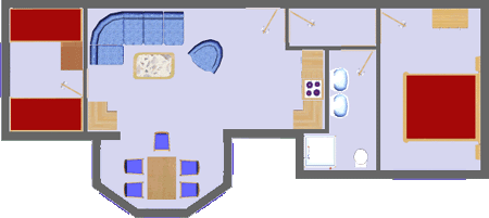 Wohnraum mit Kochnische und Spülmaschine, 1 Schlafzimmer mit Doppelbett, 1 Schlafzim. mit 2 Betten, Bad, Balkon/Terrasse, DSL-Internet Zugang